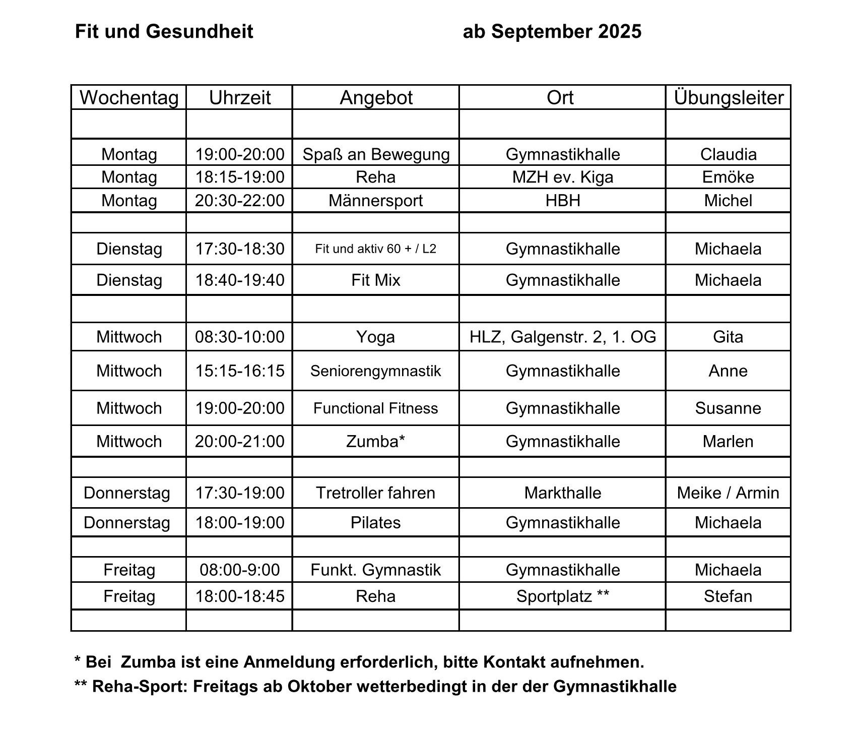 Die Seniorengymnastik findet krankheitsbedingt erst ab Oktober statt.