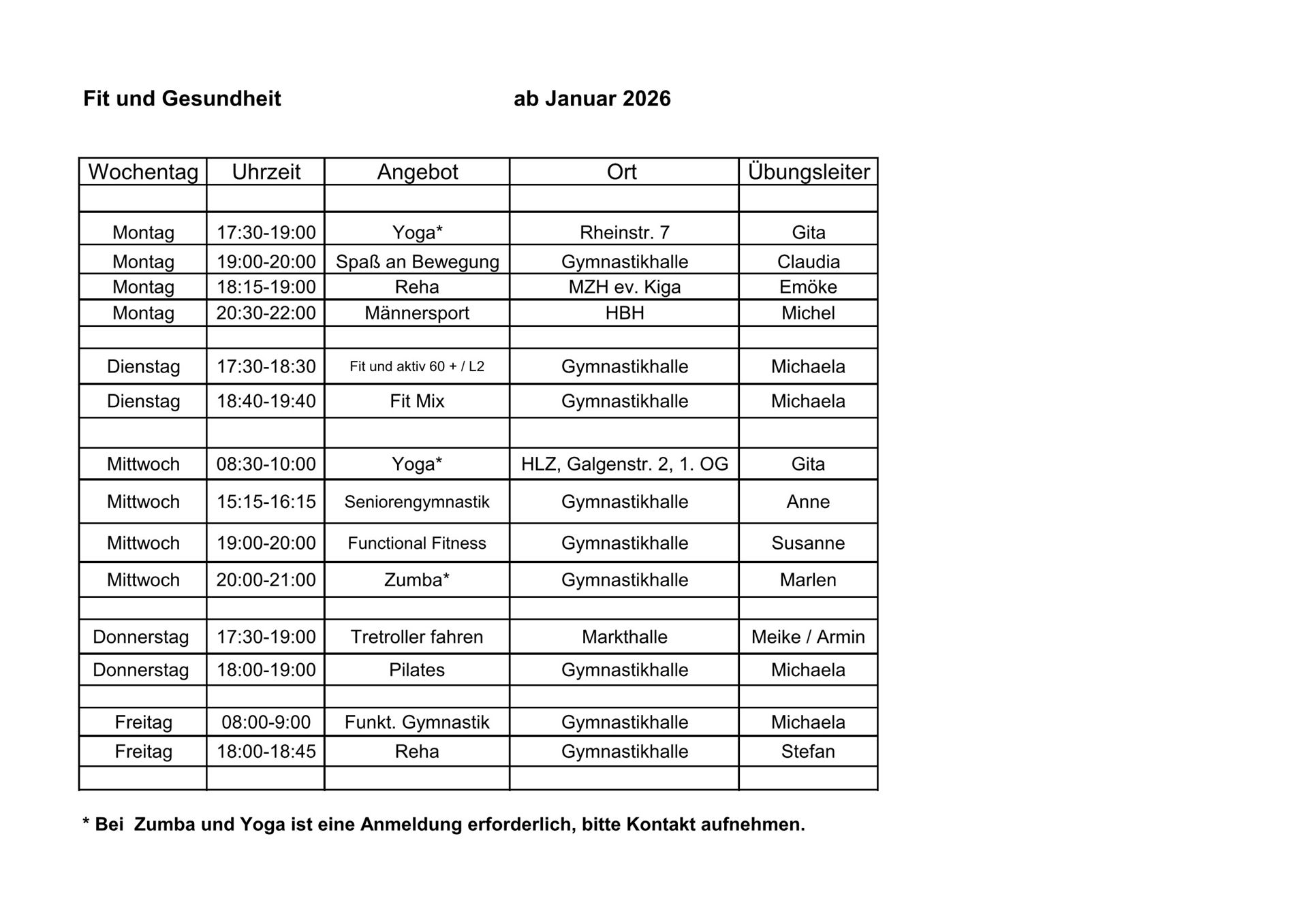Übungszeiten / Kurse