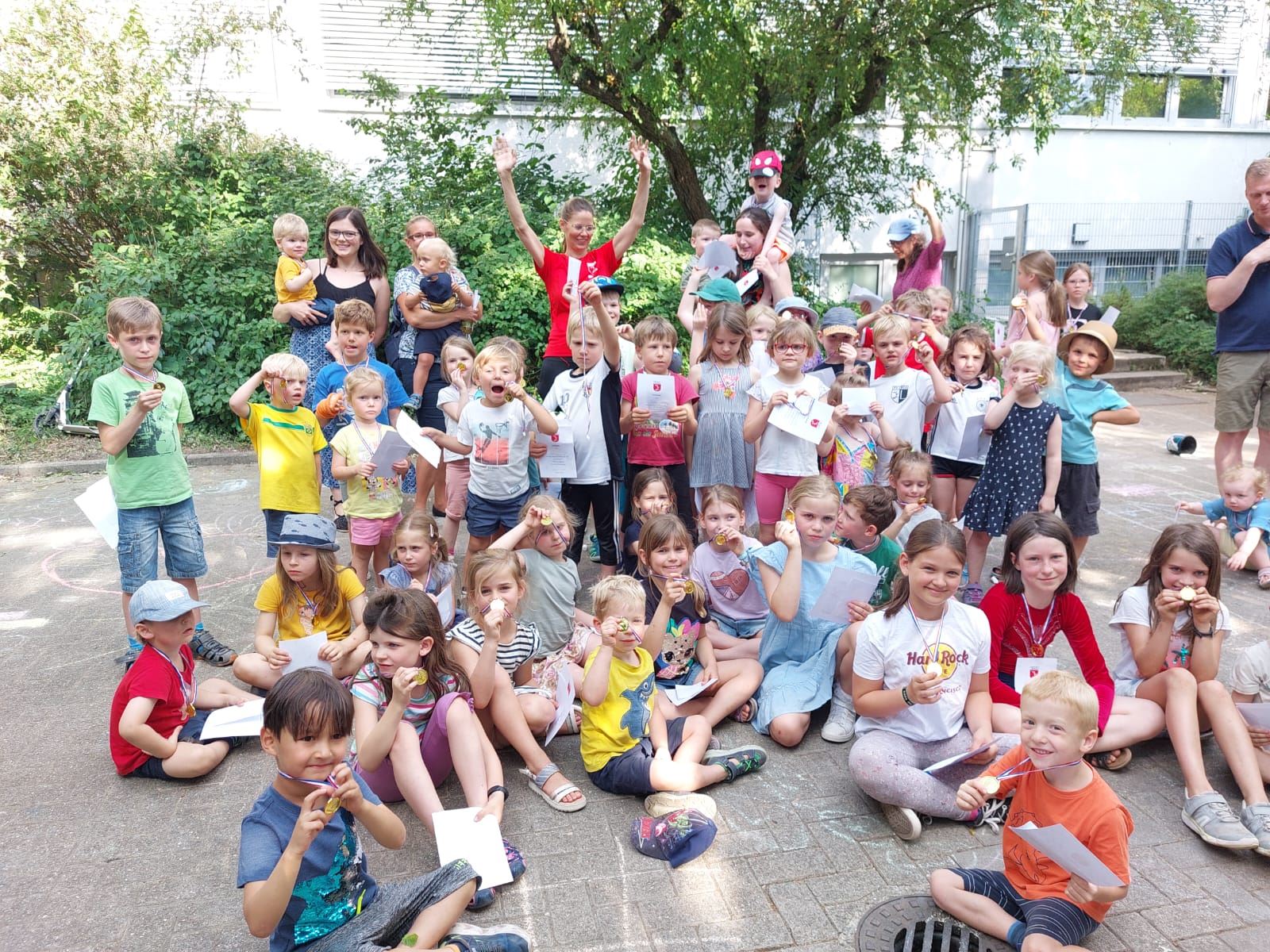 80 Kinder mit ihren Eltern, haben den Nachmittag bei sommerlichen Temperaturen in und außerhalb der Gymnastikhalle genossen. Nach einer Begrüßung und einem Aufwärmtanz gingen die Kinder mit Laufzetteln bewaffnet zu den einzelnen Stationen.