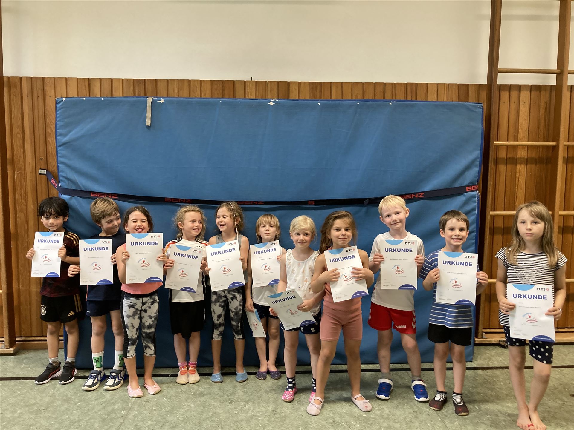 Nach der Begrüßung durch die AL Melanie Hofmann wurde das Begrüßungslied gesungen und zum Aufwärmen „Feuer –Wasser-Sturm“ gespielt. Die Kinder im Alter von 1-12 Jahren waren voll Begeisterung dabei. Danach konnten sie mit Ihren Laufkarten verschiedene Station absolvieren. Es gab eine tolle Gerätelandschaft in der Gymnastikhalle die von unseren erfahrenen ÜL Isabell und Susanne aufgebaut wurde und viele verschiedene Stationen draußen. Entweder wurden TT- Bälle im Planschbecken gelöffelt, Bilder gemalt auf Papier und auf dem Vorplatz. Es gab einen Slalom Parcours bei dem man am Ende eine Becherpyramide mit Wasser abspritzen musste, Sackhüpfen und natürlich die Trinkpause. Auch für das leibliche Wohl war gesorgt. Muffins Melone, Brezeln,… wurde von den Eltern mitgebracht für den Hunger zwischendurch. Vielen Dank für die vielen Spenden. Um 16:oo Uhr zeigten uns die Tanzmäuse was sie so alles unter der Leitung von Oxana lernen um dann im Anschluss noch gemeinsam mit allen Kindern auf das Schäfchenlied zu tanzen. Um 17:00 Uhr wurden wir von den Zumba-Kids unter der Leitung von Marlen verzaubert. Viele Kids versuchten mitzumachen und es auszuprobieren. Ja gerne könnt Ihr eure Kinder ab 5 Jahren in der Geschäftsstelle dazu anmelden. Auch die Erwachsenen durften mit viel Unterstützung von den Kindern das Tanzbein schwingen. Schnell wurden noch die letzten Stationen durchlaufen um dann rechtzeitig die Laufkarten abzugeben. Claudia hatte viel zu tun, bis alle 95 Laufzettel ausgewertet und die Urkunden geschrieben waren. Zur Siegerehrung kamen die Kinder nach vorne, um ihr Urkunde und Medaille abzuholen. Nach einem gemeinsamen Abschieds Foto halfen viele beim Abbauen, vielen Dank. Glückliche, zufriedene und stolze Kinder sind mit ihren Eltern nach Hause gegangen.