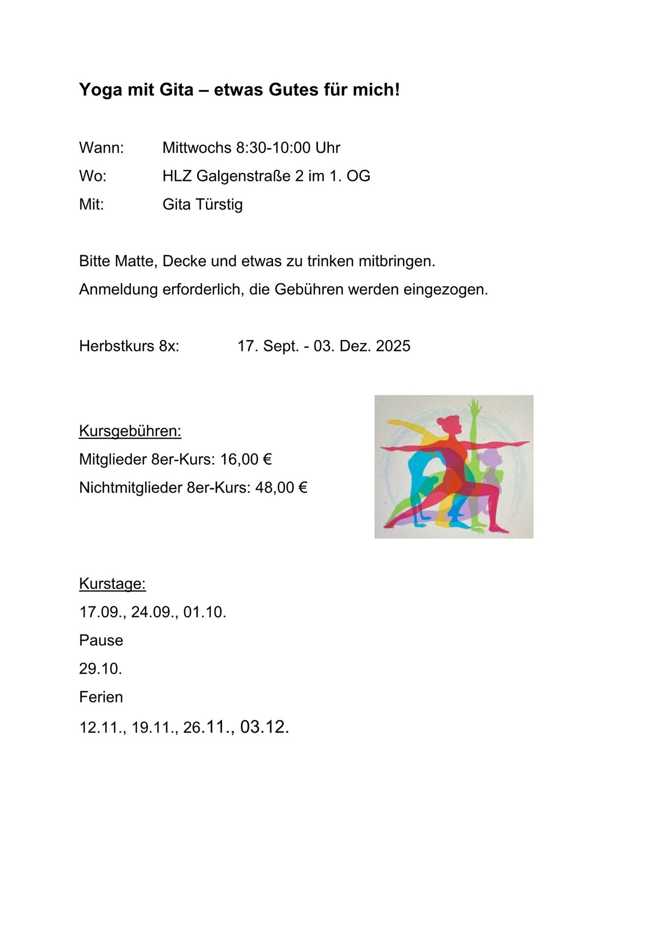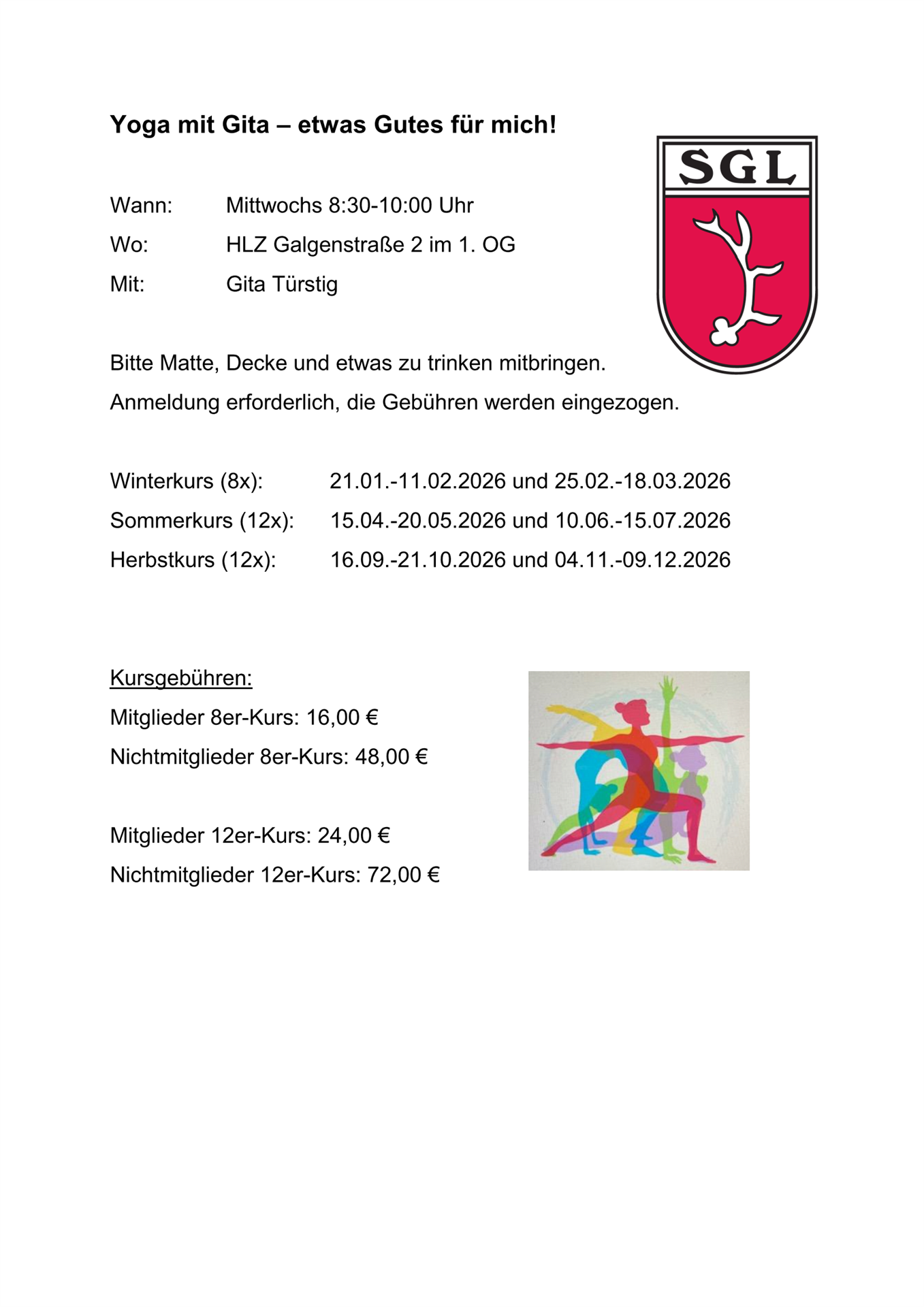 Eine Kombination aus Bewegung, Atem und Tiefenentspannung. Klassische Yoga-Asanas ( Körperübungen), verbunden mit dem Atem-, Entspannungs- und Konzentrationsübungen. Yoga dehnt und kräftigt den ganzen Körper und hilft dir, den Alltag entspannter zu meistern.
